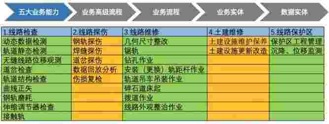 在轨道运维业务中,,,我们形成了完整的从业务能力(业务域)-业务流程-业务实体-数据模型的分析梳理过程。。轨道运维业务能力如下图所示:::