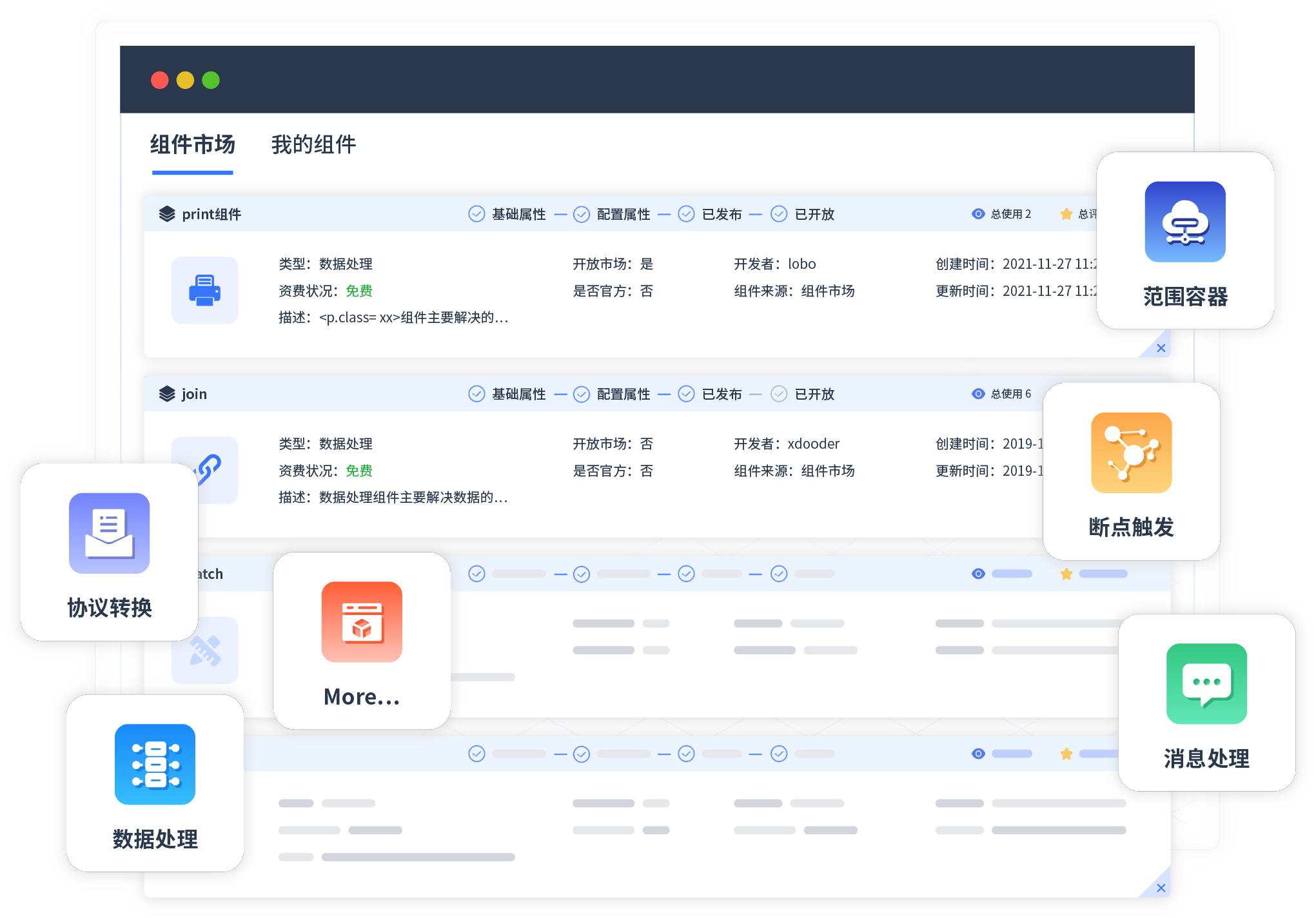 针对集成场景,,美团钱包商家版提供组件市场,,,,例如协议转换、、、消息处理、、、、文件操作等。。。。除平台提供的组件外,,,客户可以自定义所需组件。。