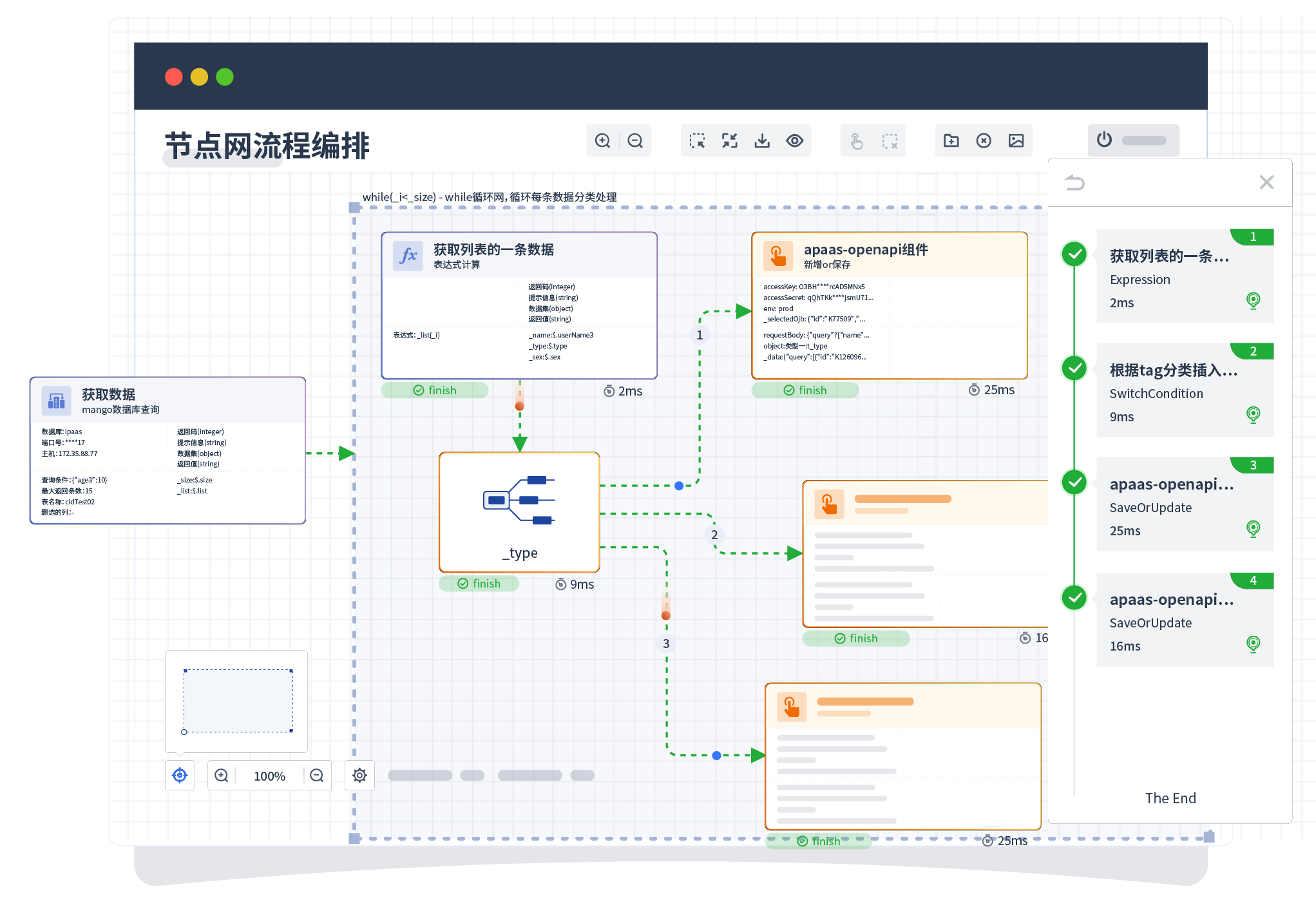 针对集成场景,,组件定义后支持进行流程编制,,不同于传统代码方式,,,通过图形化展示,,,支持在线调试、、、、日志查看和运行回放。。。。