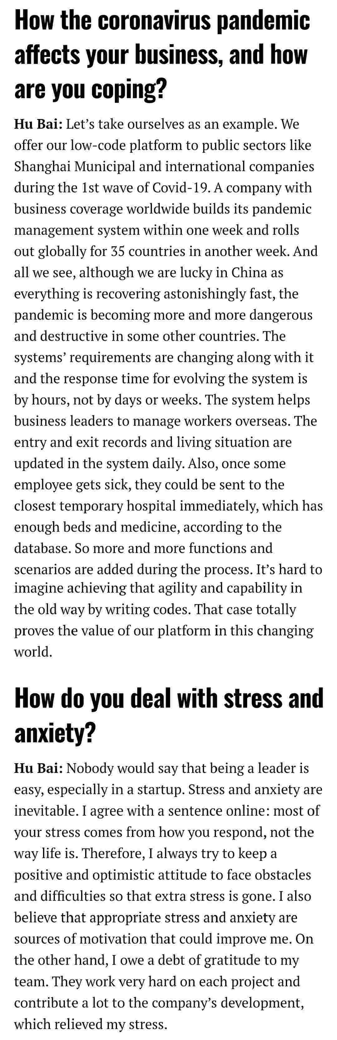 2021年年初,,,,爱湃斯科技CEO胡柏受邀接受法媒Startup.info的专访,,,,与Startup info的读者分享了自己的创业经历、、、、以及低代码平台美团钱包商家版的创新之处。。。