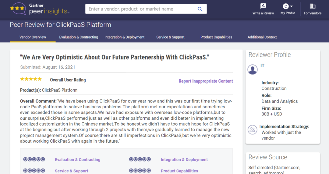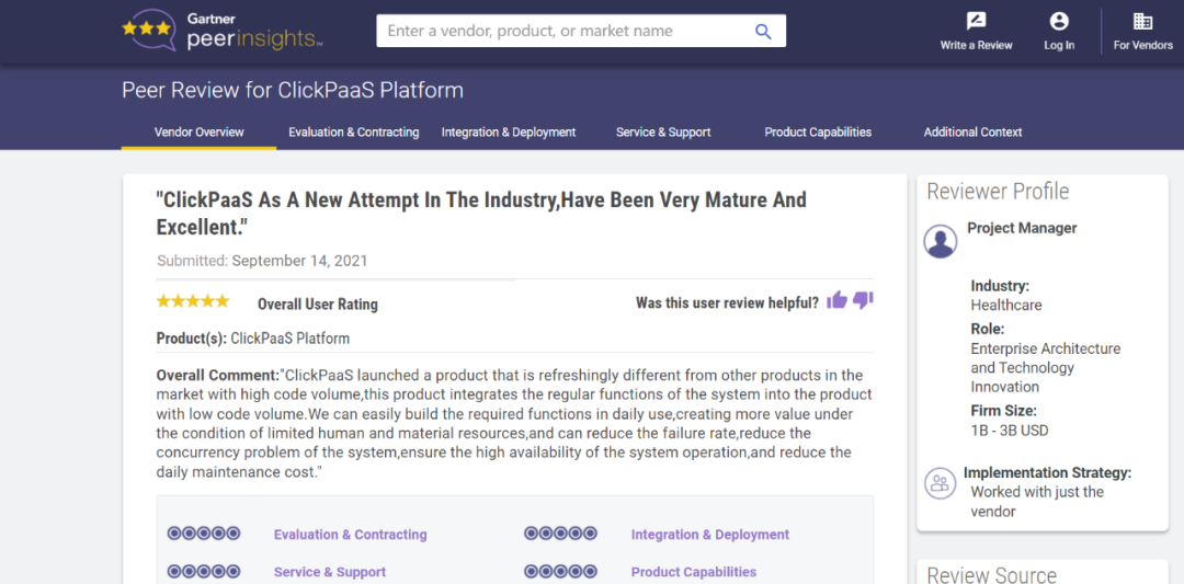 Tips::::【Peer Insights】——用户对企业IT产品和服务发布真实评价的平台。。目前已有355个市场,,255,000条经过验证的评价。。。。每一条评价Gartner会针对参评企业营收规模及参评人员信息做验证、、、评价内容做多维核实。。